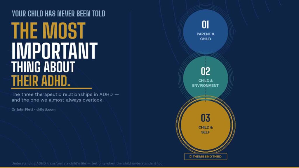 The three therapeutic relationships in ADHD management are: (1) the Parent-Child relationship — how the parent understands and responds to their child’s ADHD; (2) the Child-Environment relationship — how school, structure, and routines are adjusted to support the child’s neurology; and (3) the Child-Self relationship — how the child themselves understands their own ADHD, identity, and neurological profile. The third is the most neglected in clinical practice, and may be the most important for long-term outcomes.